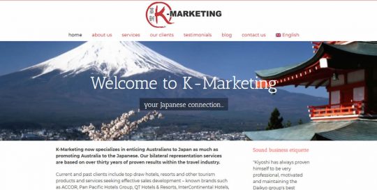 Mark Bulley2018-09-30T09:52:54+10:00K-Marketing Based in Sydney, K-Marketing offer a comprehensive range of Japanese marketing services for Australian tourism operators and now also represents Japanese product in Australia seeking to take advantage of the growing influx of Australians wishing to explore traditional Japan.